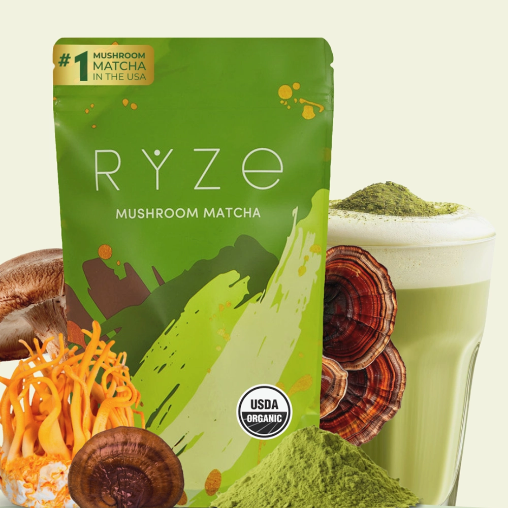 RYZE SUPERFOODS Mushroom Matcha, USDA Organic with 6 Adaptogenic Mushrooms and Ceremonial-Grade Matcha for Energy, Focus, Digestion, Immunity with Turkey Tail, Shiitake, Lion’s Mane, 30 servings(30 Servings)