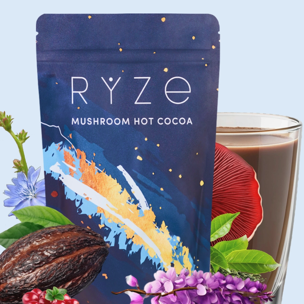 RYZE SUPERFOODS Mushroom Hot Cocoa Melatonin Sleep Supplement, Keto Cocoa Powder with Reishi Mushroom, Melatonin, Glycine, Cacao, L-Theanine, Chicory to Help Fall Asleep and Stay Asleep, 20 Servings