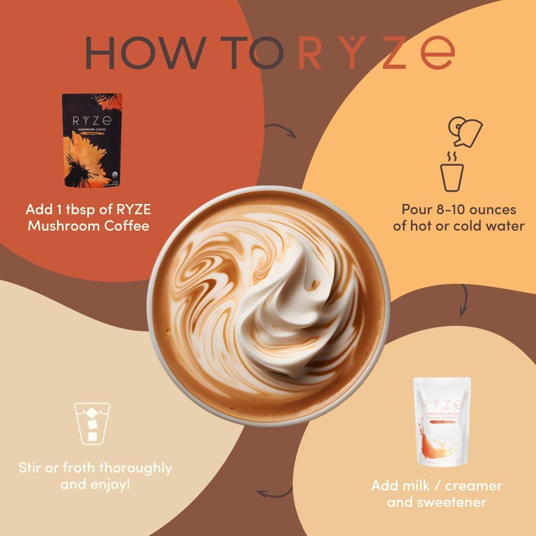 imageRYZE SUPERFOODS Mushroom Coffee USDA Organic with 6 Adaptogenic Mushrooms and MCT Oil USA Grown Instant Coffee for Better Energy Focus Digestion Immunity with Lions Mane ampamp Turkey Tail 30 servings635 Pack of 1
